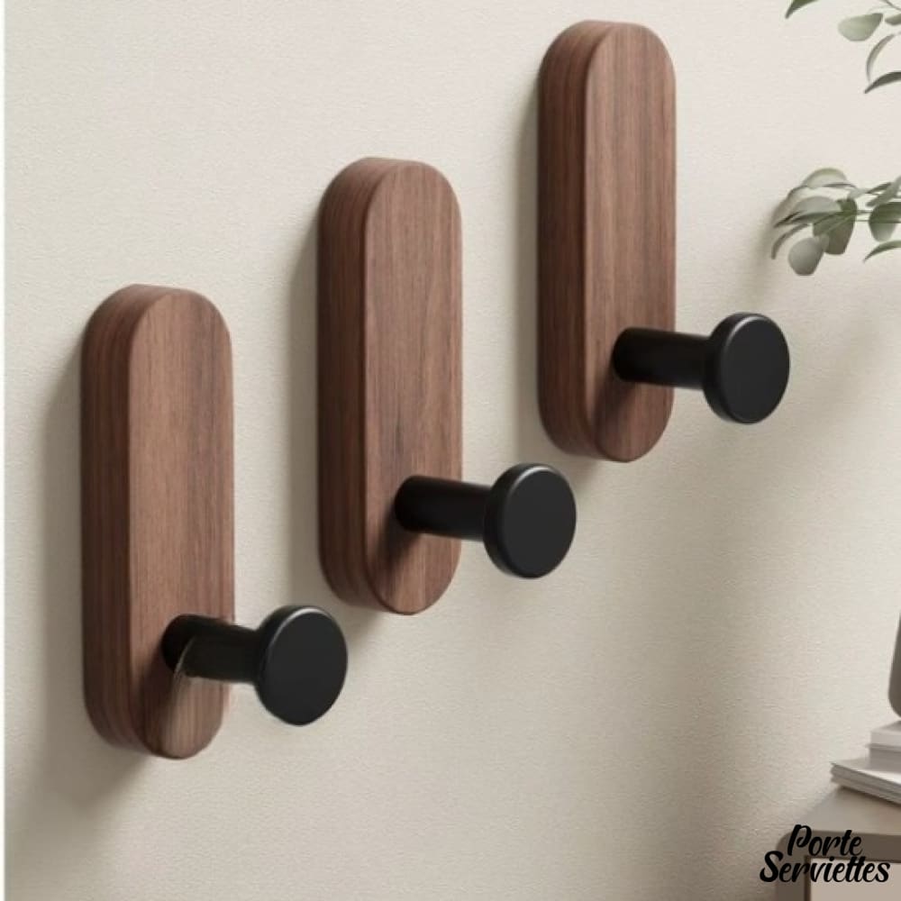 - Un crochet porte-serviettes au design épuré, alliant bois naturel et acier moderne.