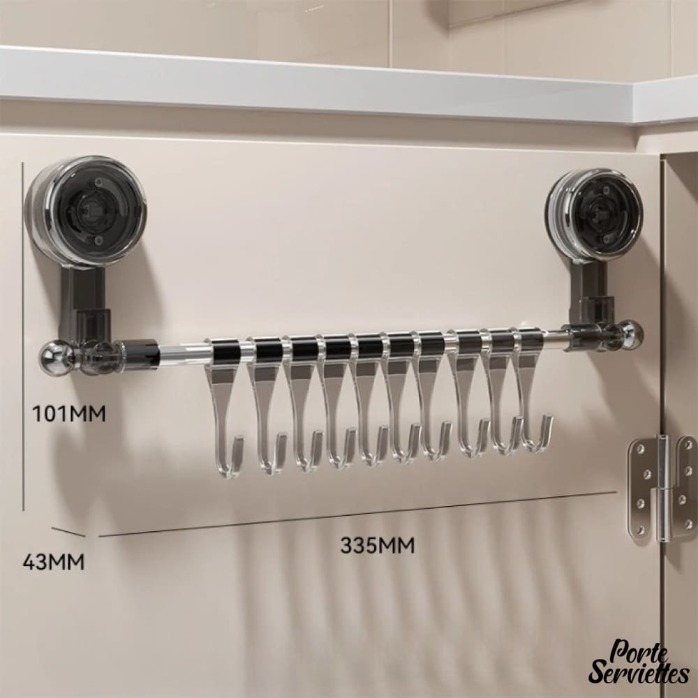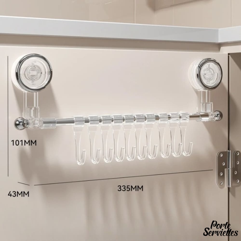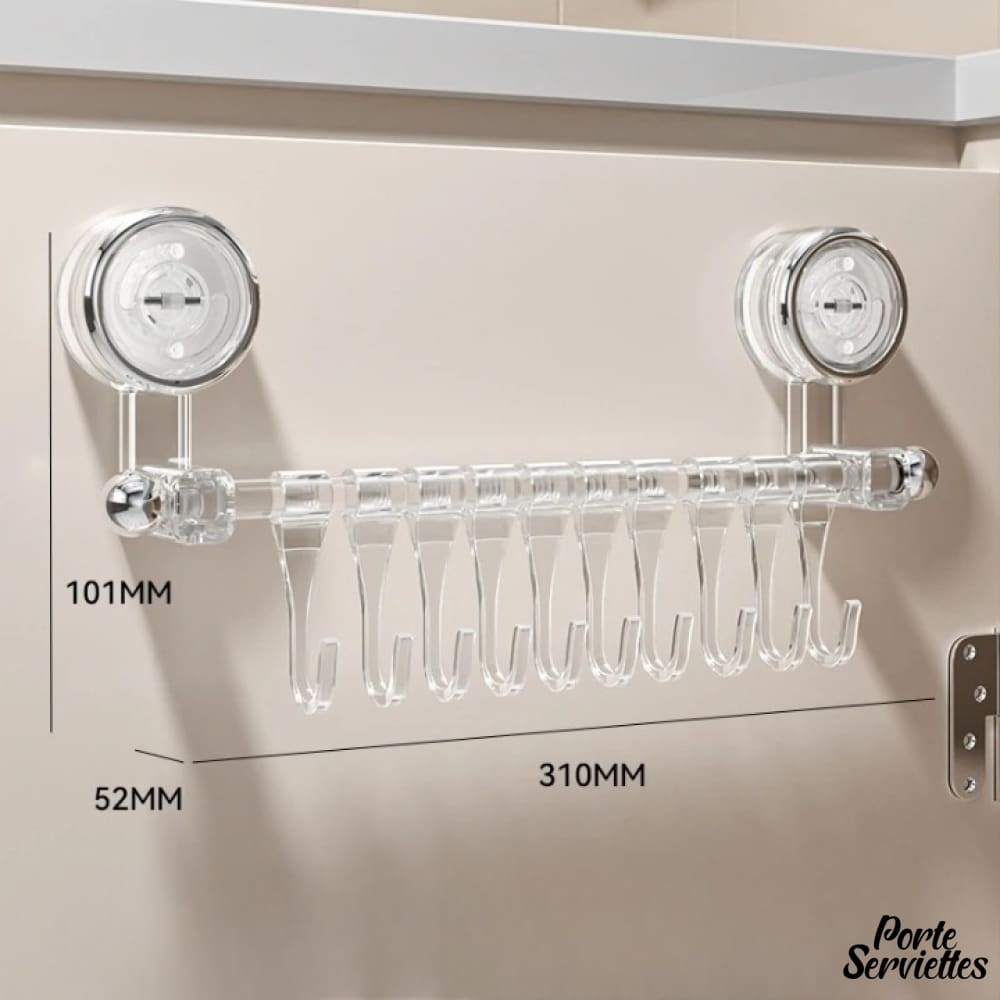 - Barre transparente en PET, presque invisible, avec 10 crochets en acier inoxydable aux courbes douces.