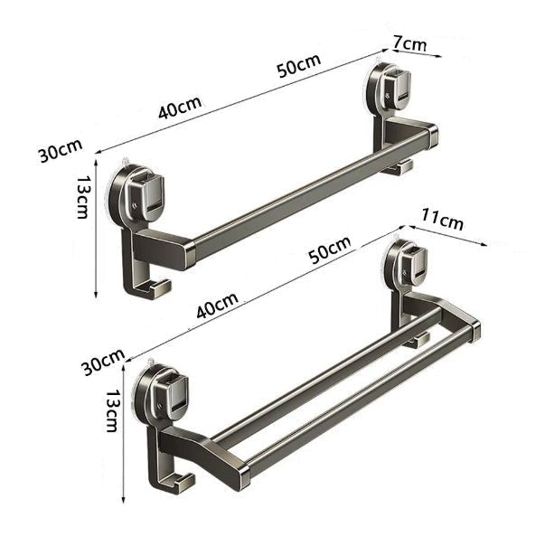 Les porte-serviettes se déclinent aujourd'hui en différentes versions de design et de matières variées pour toutes les décos et les ambiances. Découvrez le charme de ce porte-serviette en métal gris au design élégant. Ajoutez une touche d'esthétique à votre espace et profitez de son style contemporain. Maximisez l'espace avec ce porte-serviette doté de barres simples ou doubles offertes en 4 dimensions pour répondre à vos besoins. Les deux crochets inclus permettent de suspendre facilement vos articles de toilette et de faire sécher votre drap de bain de manière pratique. Il est amovible et réutilisable comme bon vous semble après avoir nettoyé les ventouses. Ce porte-serviettes est idéal pour faire sécher votre linge quotidiennement sans souci et en beauté !