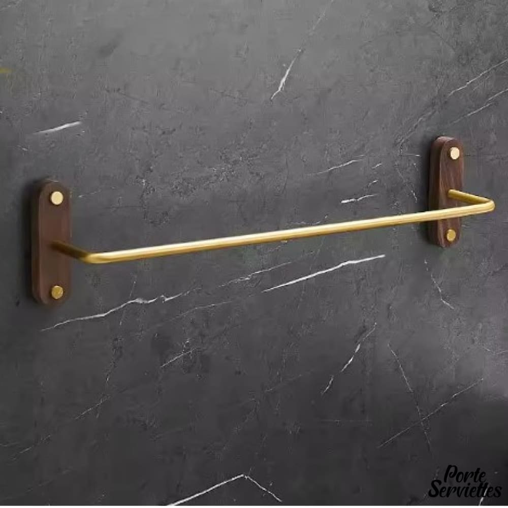 Barre porte-serviette murale en bois pour salle de bain – Une barre dorée sublimée par des fixations en noyer.