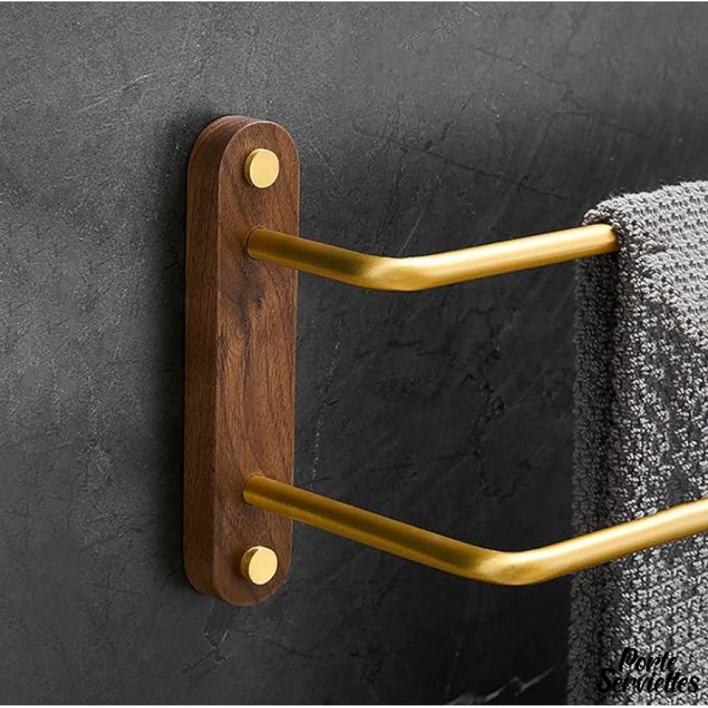 Avec ses barres dorées et ses supports en noyer massif, ce porte-serviettes joue sur les contrastes pour créer un impact visuel immédiat.