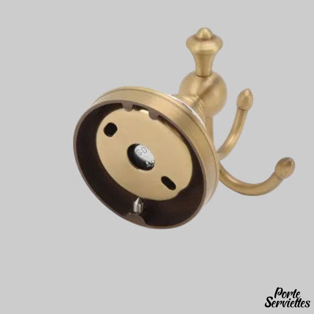 - Trois crochets en laiton doré, courbés pour une prise optimale des serviettes.