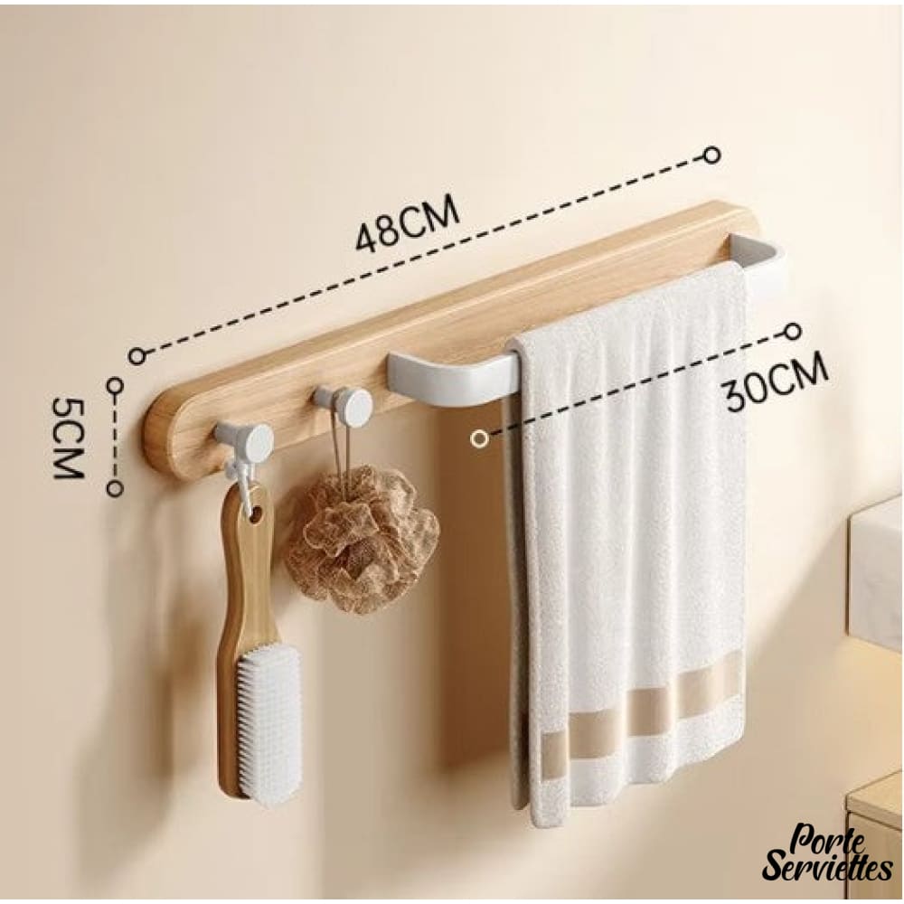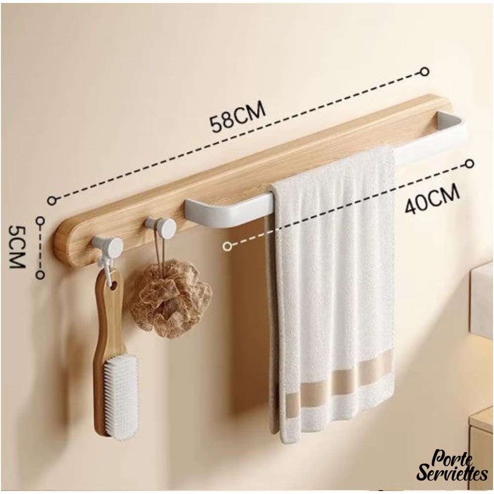 Ce porte-serviettes combine une barre en aluminium blanc laquĂ© et un support en bois de hĂȘtre clair, offrant une esthĂ©tique sobre et moderne.