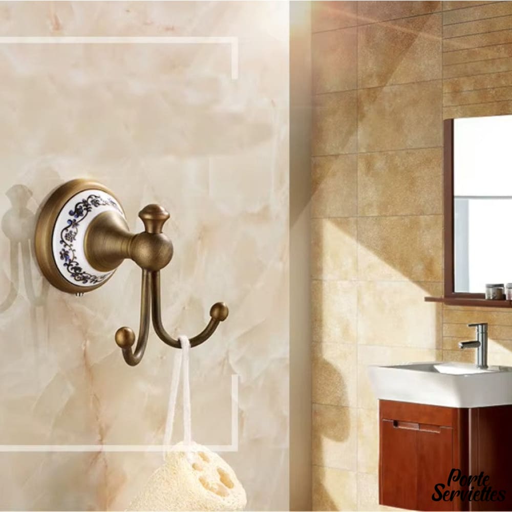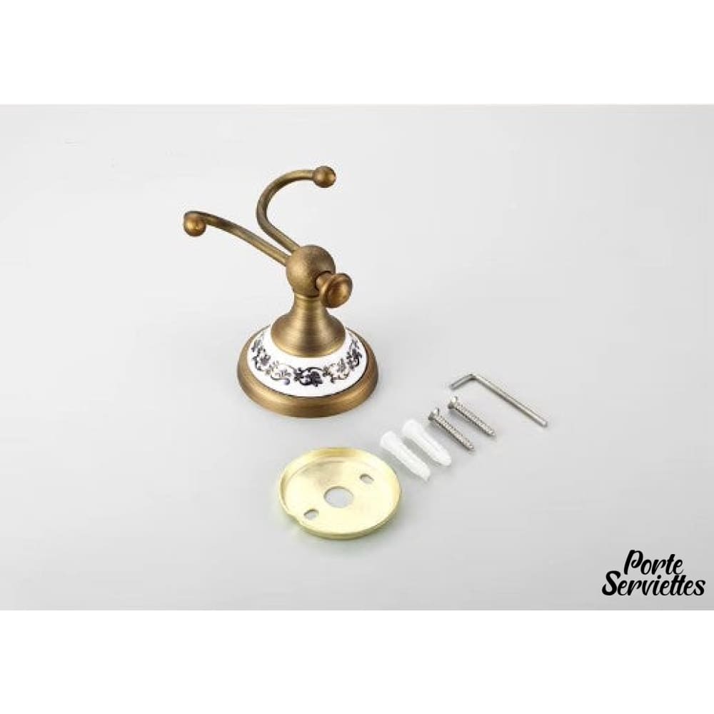 Ce crochet se distingue par sa base en céramique décorée et ses bras en laiton, en faisant un élément décoratif remarquable.