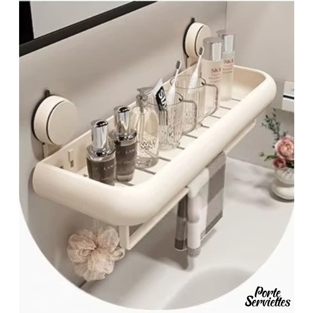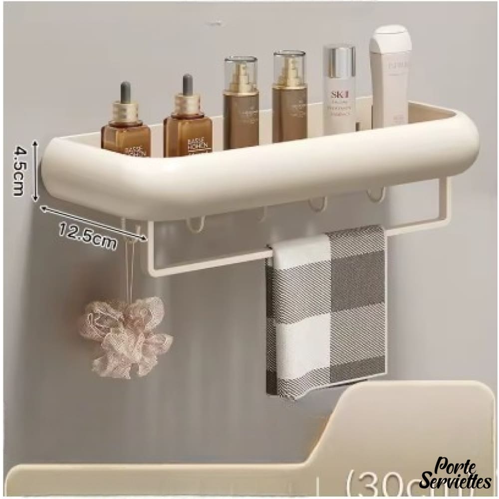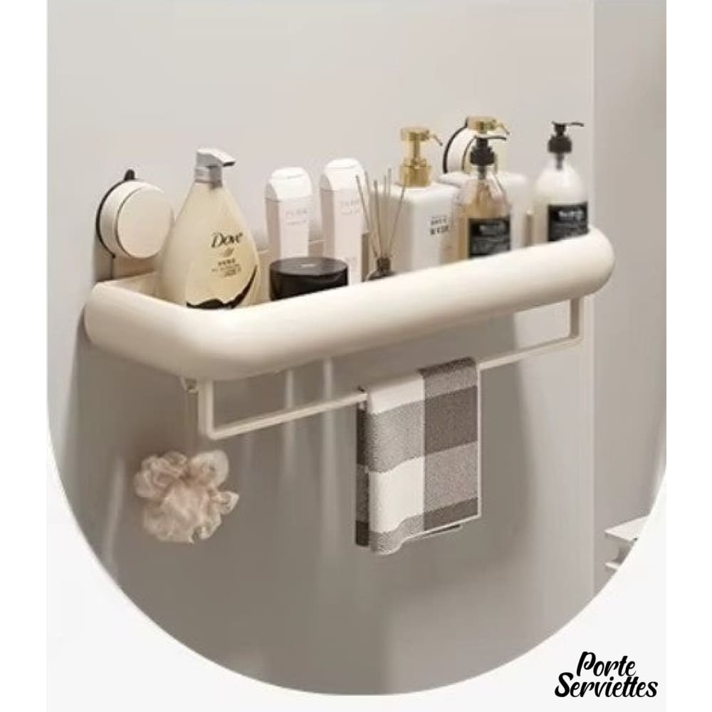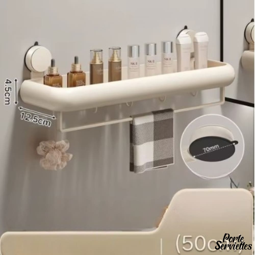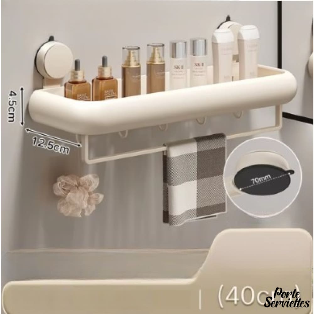 - Design fonctionnel : étagère en alliage d’aluminium et plastique ABS, coloris beige doux, avec barre de suspension intégrée pour serviettes ou accessoires.
